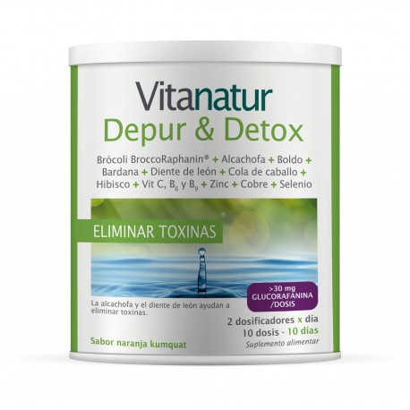 El Vitanatur Depur&Detox es un complemento alimenticio indicado para limpiar el organismo. Este producto es ideal para iniciar una dieta de adelgazamiento, ya que ayuda a eliminar las toxinas de manera efectiva. Su fórmula ha sido cuidadosamente elaborada a base de ingredientes activos seleccionados, que incluyen Brócoli Broccoraphanin, alcachofa, boldo, bardana, diente de león, cola de caballo, hibisco, vitamina C, B6 y B9, así como Zinc, Cobre y Selenio.